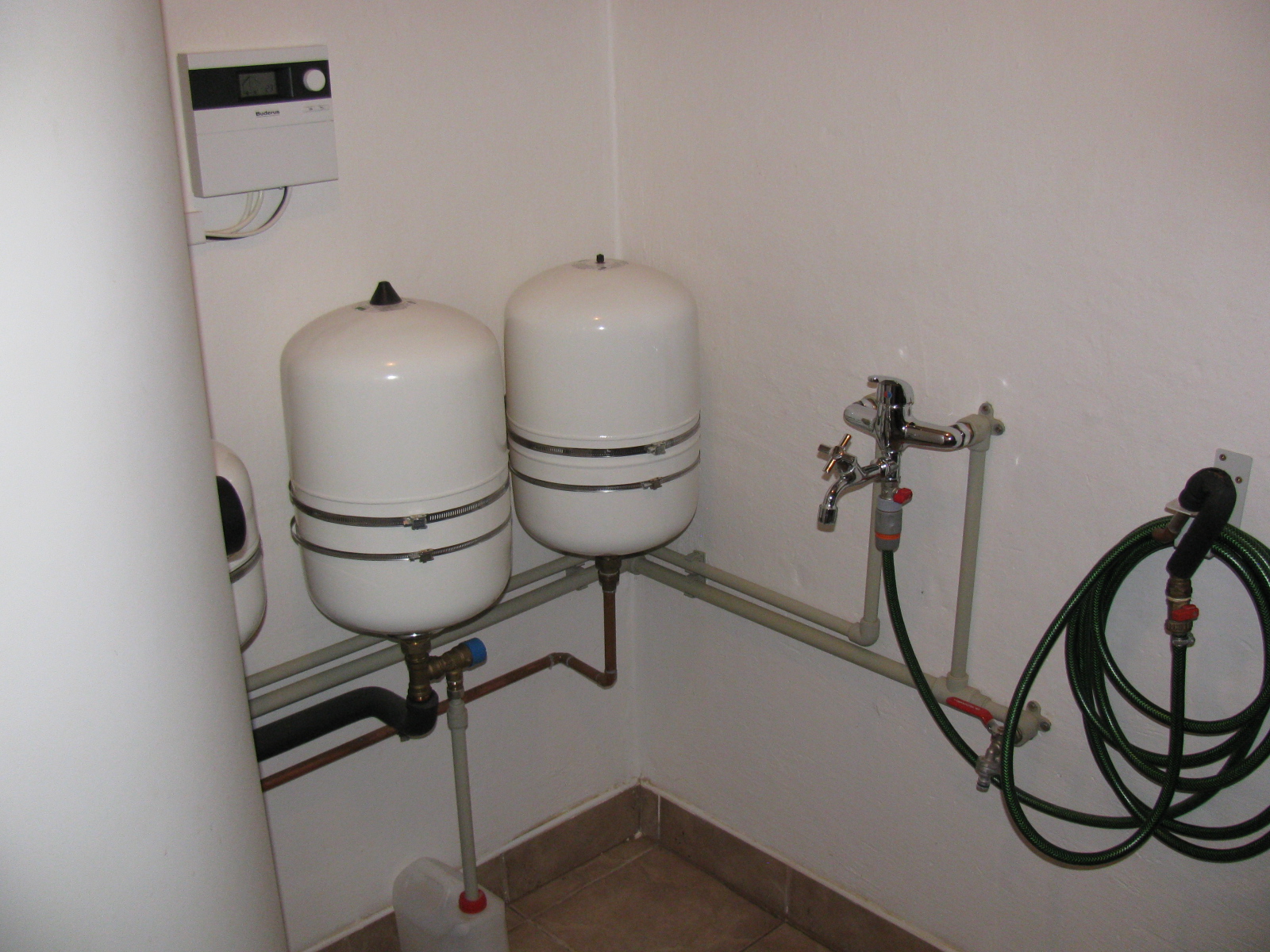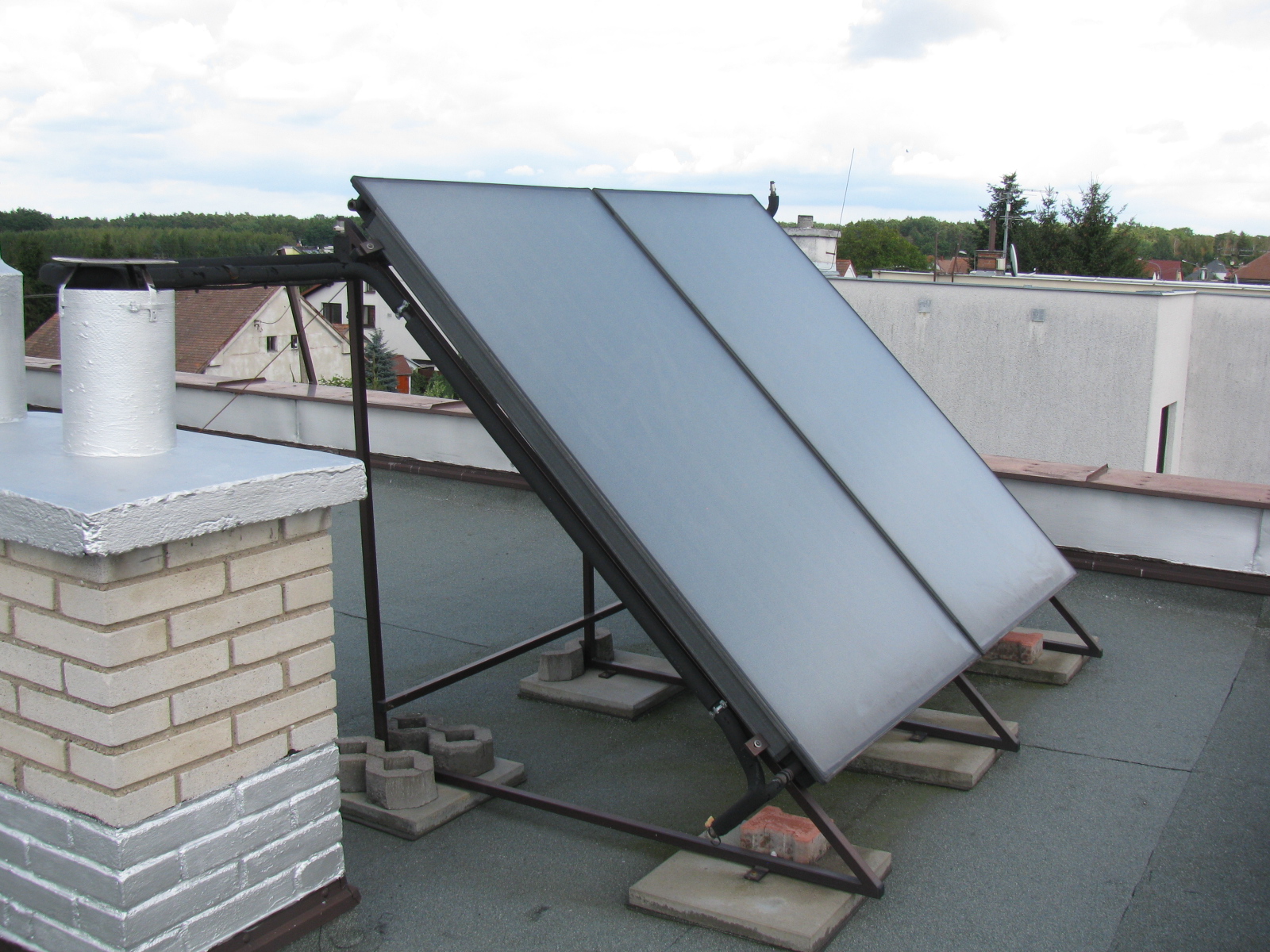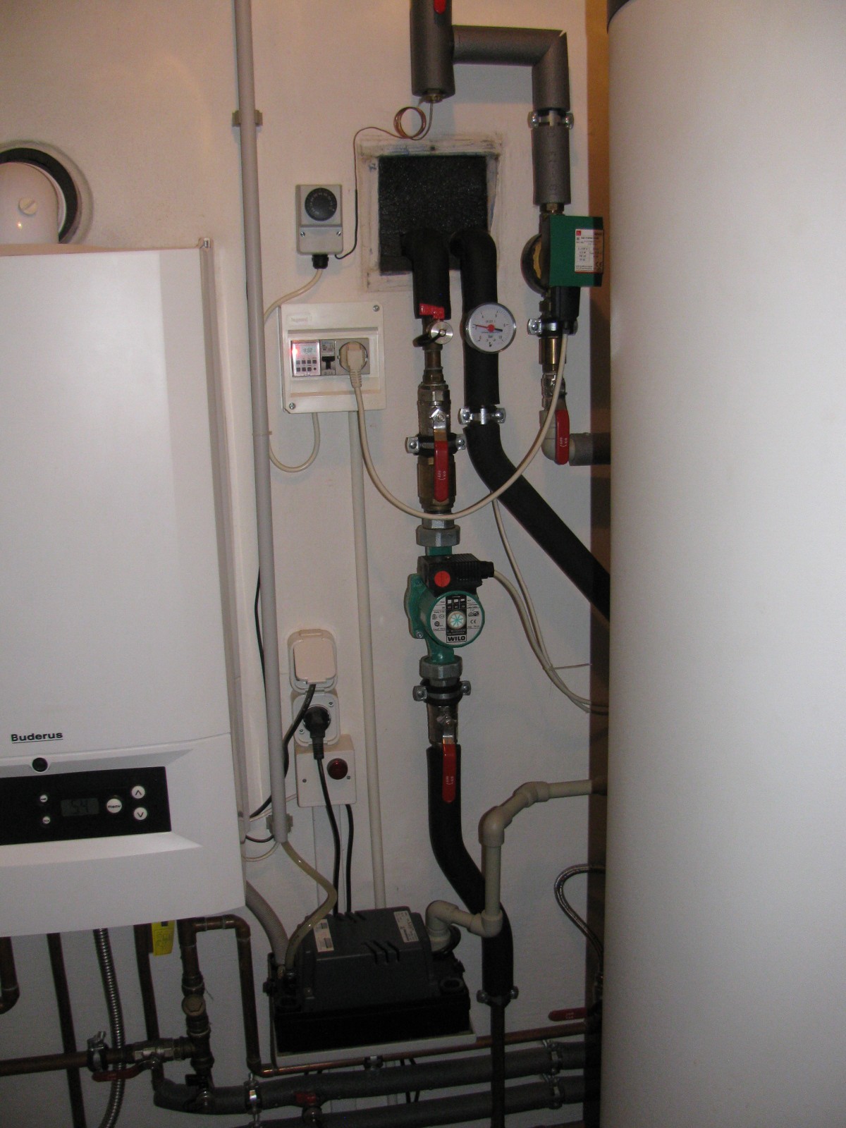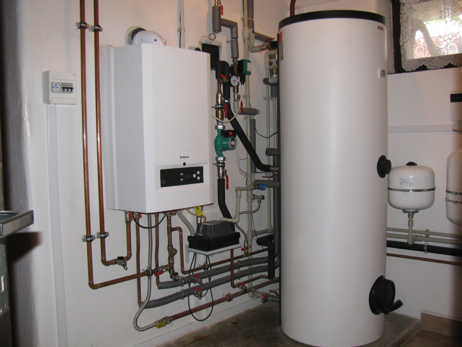Kotel Buderus GB - 022 s bojlerem Dražice OKC 300 NTRR/SOL, připojený na dva solární kolektory Buderus pro ohřev TUV.